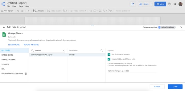 Once you click on Google Sheets, you are able to search for the Spreadsheet that you want to connect to Google Data Studio in order to import the data. Choose the worksheet, configure the options and click on Add.