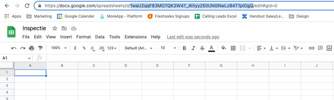 Voeg vervolgens de Spreadsheet ID toe, deze vind je in de URL van de spreadsheet zoals hieronder aangegeven.