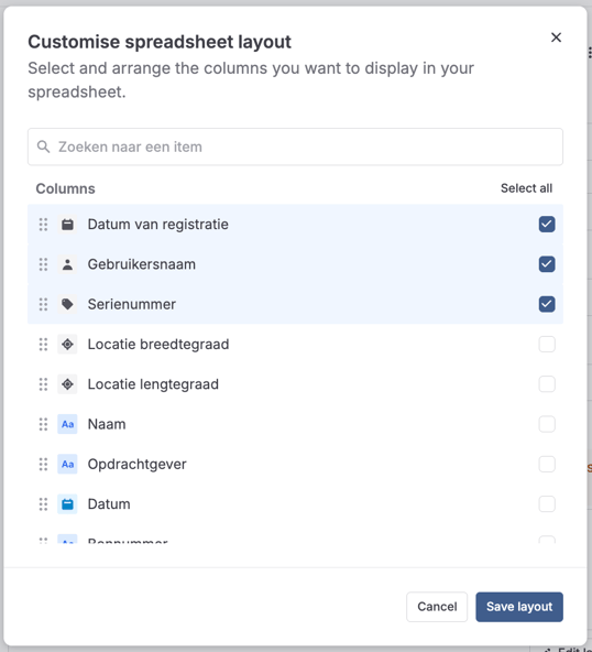 Onder Spreadsheet columns kun je de indeling van de kolommen in de spreadsheet aanpassen. Klik op Edit layout om de kolommen te ordenen zoals jij wilt.