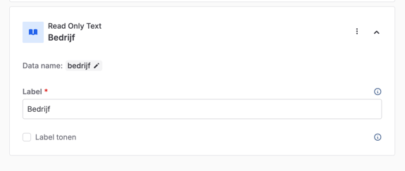 Klik op het potloodje van het Read-only tekst veld en bewerk de instellingen en beslis of je deze titel in het formulier wilt laten zien door op Label tonen te klikken.