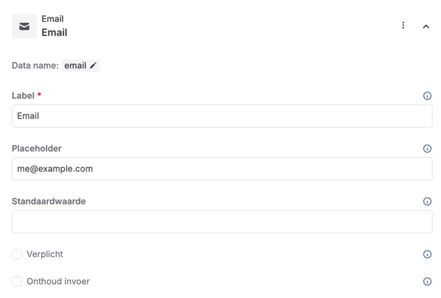 De placeholder die je gebruikt in het Properties scherm van de velden laten een voorbeeld zien van wat er ingevuld kan worden. Bijvoorbeeld, bij het configureren van het Email veld kun je een e-mailadres ingeven als placeholder.