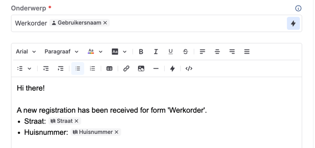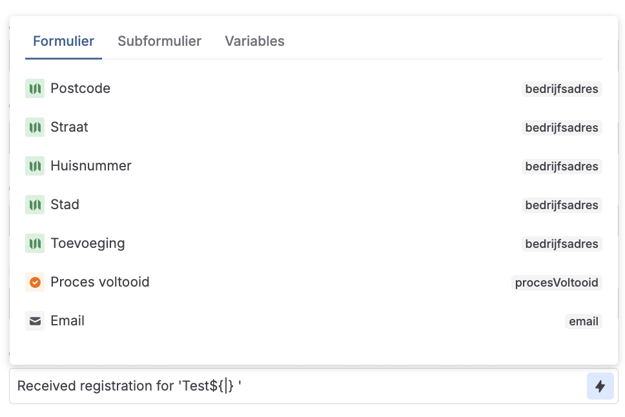 Klik op het bliksemicoon en je ziet een lijst met alle velden die je aan het formulier hebt toegevoegd. Je vindt er ook placeholders die variabelen zoals de lengtegraad, breedtegraad en het serienummer aangeven.