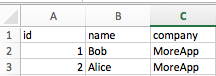 | [ { "id": 1, "name": "Bob", "company" : "MoreApp" }, { "id": 2, "name": "Alice", "company" : "MoreApp" } ] |