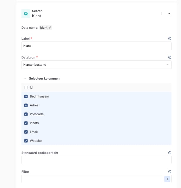 Voeg een Search veld toe aan je formulier, zodat de gebruiker door de data kan zoeken. Klik om de eigenschappen van het zoekveld te bewerken. Je kunt het veld een naam geven bij ‘Label’ en de databron selecteren die je net hebt aangemaakt.