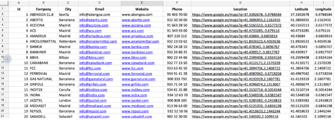 Maak als eerste een database aan met de informatie die je wil importeren zoals bedrijf, stad, e-mail website en telefoon. Je kunt een database maken met behulp van Excel, Google Spreadsheets of een URL.