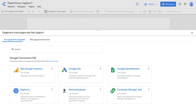 Let op: In deze Help Center post gebruiken we Google Data Studio als voorbeeld, maar je kunt ook een andere tool zoals Power BI, Tableau of Oracle gebruiken. In dit voorbeeld gebruiken we Google Spreadsheets als database. Je kunt ook Excel Online of een andere database gebruiken.
