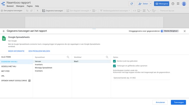 Nadat je op Google Spreadsheets hebt geklikt, kun je zoeken naar de spreadsheet die je met Google Data Studio wilt verbinden om de gegevens te importeren. Kies het werkblad, configureer de opties en klik op Toevoegen.