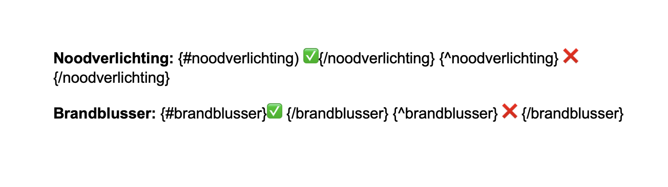 Het is van belang om de velden te openen en te sluiten (op dezelfde manier als de 'loops' bij de Subformulieren, met # en /). Op deze manier zijn de velden alleen zichtbaar wanneer er data is ingevuld.