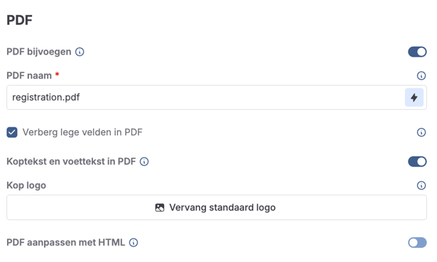 Je kunt deze optie in afzonderlijk inschakelen. Als je bijvoorbeeld twee mails toegevoegd hebt aan je formulier, kun je deze optie activeren voor de PDF van de ene e-mail en de eenvoudige PDF behouden voor de andere e-mail.