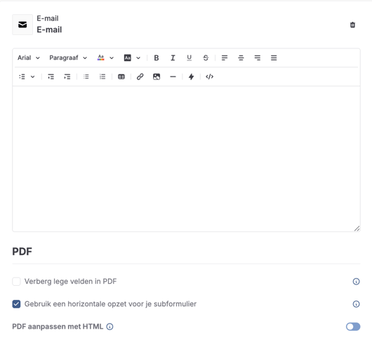 Ga naar het specifieke subformulier dat je wilt configureren en open het tabblad E-mail. Ga in de PDF-sectie naar de optie 'Gebruik een horizontale opzet voor je subformulier' en selecteer deze als je de gegevens van een subformulier horizontaal wil weergeven in het PDF-bestand.