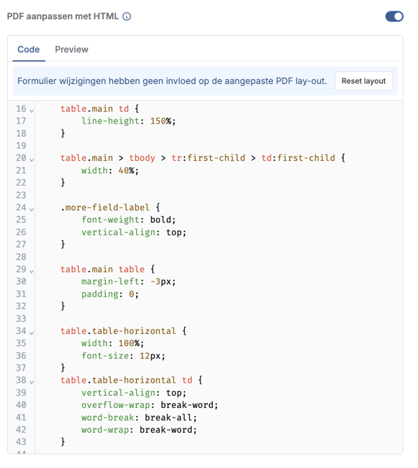 Als je kennis hebt van HTML en je rapport handmatig wilt aanpassen, kun je de optie 'PDF aanpassen met HTML' activeren. Het tabblad Code wordt geopend, zodat je de HTML kunt aanpassen.