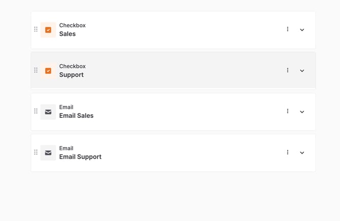 Voeg de Email velden toe onder de Lookup- of Checkbox velden. Elke Email veld staat voor een andere optie. Daarom moet je net zoveel Email velden toevoegen als dat je opties hebt geconfigureerd.