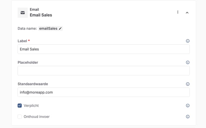 Configureer elke Email veld. Voeg een naam toe bij Label, voor een makkelijkere herkenning, en voeg het e-mailadres van de ontvanger toe bij Standaardwaarde.