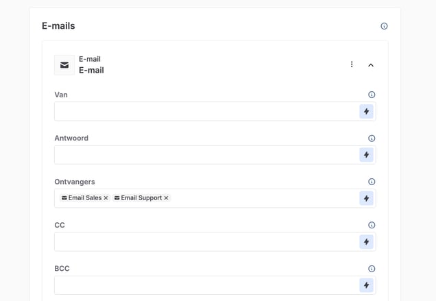 Ga naar de Email tab en voeg alle Email velden als ontvanger toe. Ga naar de sectie Ontvangers en zoek ze op door te klikken op het bliksemschicht-icoon.