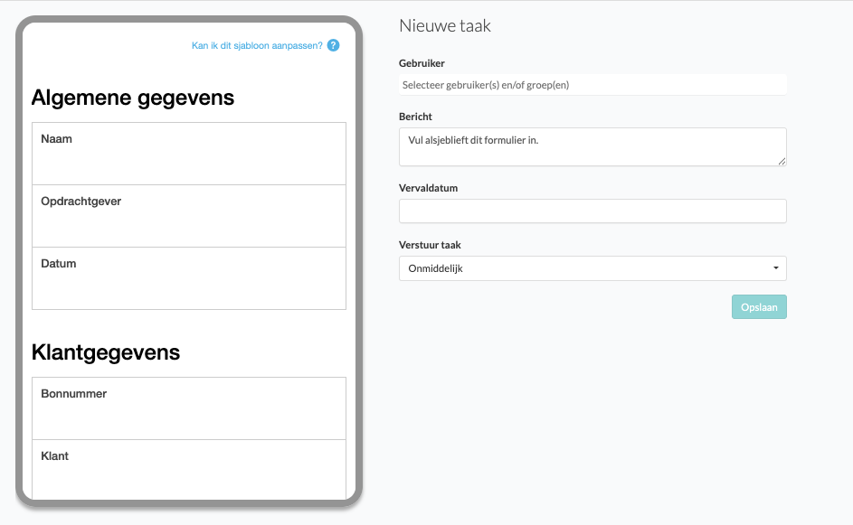 Vul aan de linker kant de informatie in die beschikbaar is. Kies één of meerdere ontvangers van de taak of selecteer een groep. Typ er eventueel een bericht bij. Kies vervolgens wanneer je de taak wilt versturen en klik op Opslaan.