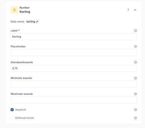 Voeg een tweede Number veld toe en geef deze de naam 'Korting' bij de Label. Voeg de hoeveelheid korting toe bij Standaardwaarde.