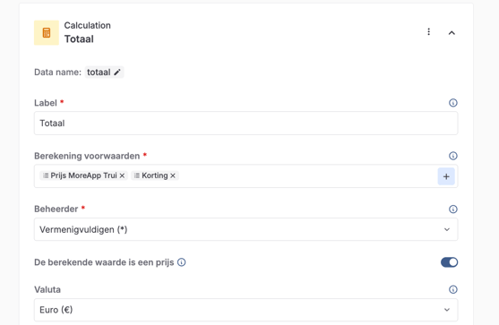 Geef het veld de naam ‘Totaal' onder Label. Als Bewerking kun je Vermigvuldigen ( * ) kiezen. Bij Berekening voorwaarden selecteer je: ‘Prijs MoreApp Trui’ en 'Korting’.