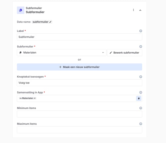 Gebruik een Subform om herhaaldelijk dezelfde items toe te voegen aan je hoofdformulier. Bijvoorbeeld voor het vullen van de gebruikte materialen, gewerkte uren, foto's en gebouwdelen.