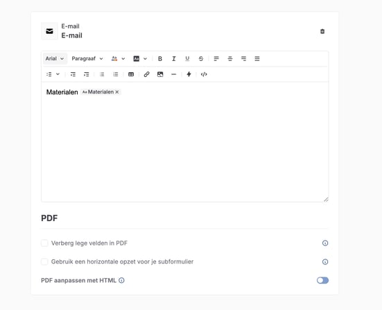Ga naar het E-mail-tabblad in je subformulier om je e-mail in te stellen. Let op: jouw instellingen worden toegevoegd aan de e-mail van het hoofdformulier. Gebruik de plaatsaanduidingen in de e-mail om je tekst aan te passen. Je kunt ook lege velden verbergen en de gegevens horizontaal weergeven.