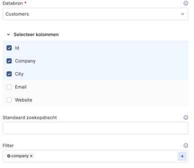 Als het Zoekveld “Bedrijf” heet en je wilt de naam van het bedrijf ophalen, dan wordt de placeholder: ${bedrijf.naam}.