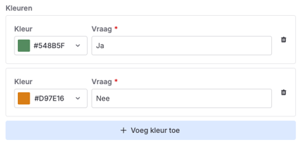 Je kunt zoveel kleuren toewijzen als je zelf wil. Klik hiervoor meerdere keren op Voeg toe. Standaard wordt er iedere keer dat je op Voeg toe klikt een andere kleur weergegeven. Je kunt deze kleur veranderen en aanpassen in een kleur naar voorkeur.